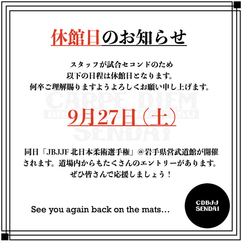 スタッフが試合セコンドのため9月27日(土)は休館日となります。何卒ご理解賜りますようよろしくお願い申し上げます。